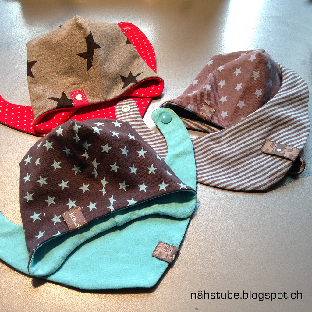 Aus Stoffresten habe ich ein paar Baby Halstücher und Mützen genäht. Man kann sie alle wenden und auf beiden Seiten tragen… Somit hat man viele Möglichkeiten zum kombinieren.